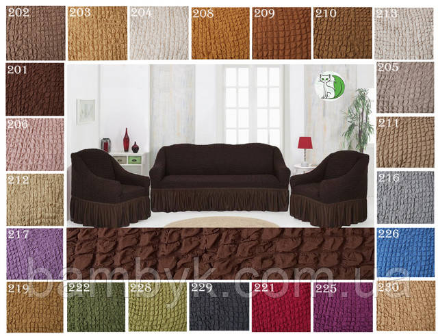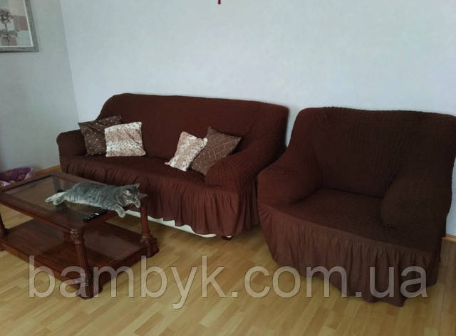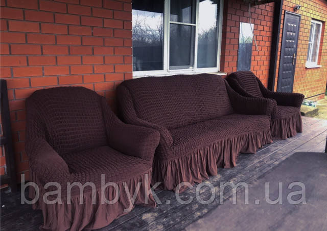 Накидки чохли для меблів з оборкою на диван і два крісла натяжні жатка-креш преміум Concordia Туреччина шоколад