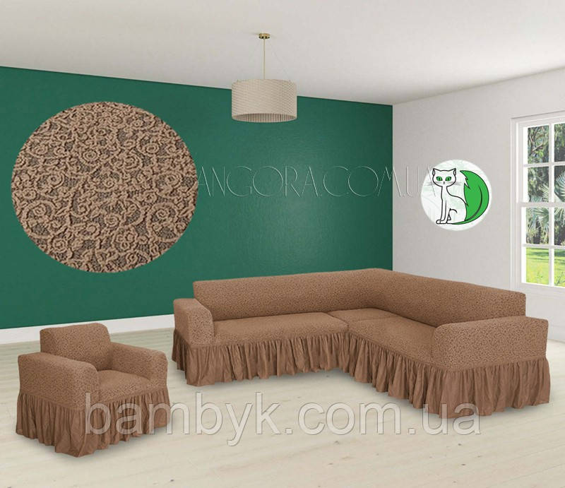 Чохол натяжний Жакардовий Для Кутового Дизайну та Чохол На Крісло З Оборкою бежевий Venera