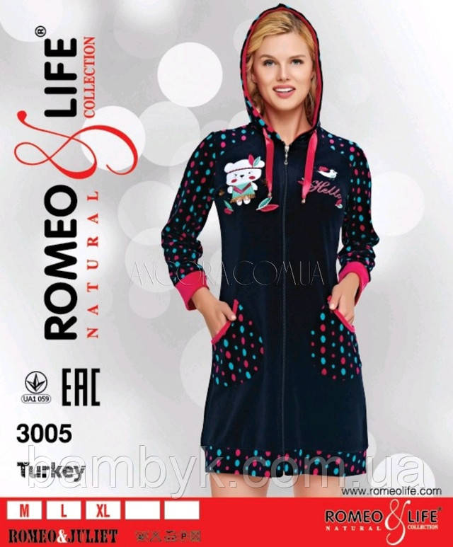 Короткий Жіночий Велюровий Халат На Блискавці Romeo&Life № RL-3005