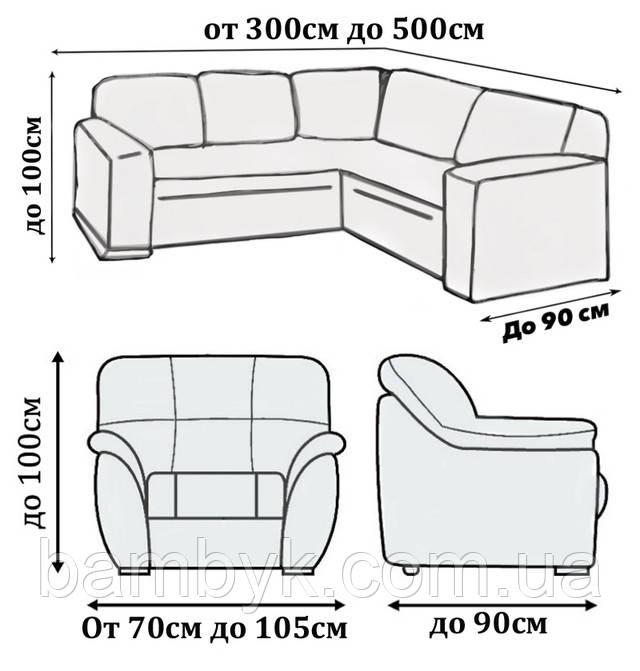 - Для того щоб зробити вибір, потрібно точно знати розміри Вашого кутового дивана і крісла, довжина від краю до краю із зовнішнього боку. Цей параметр може бути в діапазоні від 300см до 500см (це допустима менша і більша межа) Висота дивана від підлоги до верхньої точки, максимум до 1м